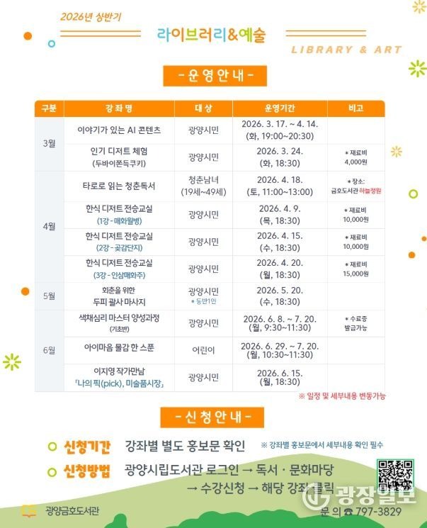 프로그램 신청은 강좌별 모집 일정에 따라 2월 23일 오전 10시부터 선착순으로 진행되며, 자세한 사항은 광양시립도서관 누리집에서 확인하거나 금호도서관으로 문의하면 안내받을 수 있다.