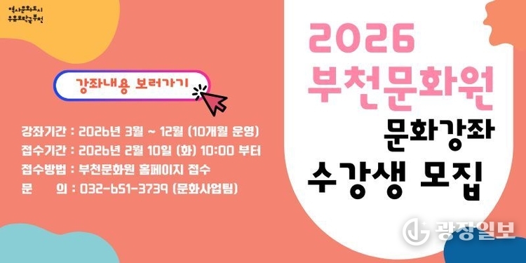 광장일보= 주재영 기자 | 부천문화원이 2026년 문화강좌 수강생을 모집한다. 올해로 설립 60주년을 맞은 부천문화원은 지역문화의 기틀을 다져온 공공문화예술기관으로, 시민의 일상 속에서 역사·문화·예술의 기반을 넓혀가고 있다.
