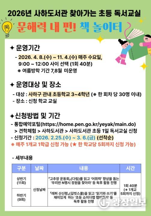 광장일보 주재영 기자 | 부산시교육청 사하도서관은 4월부터 11월까지(7, 8월 제외) 사하구 관내 초등학교에서 3~4학년 학생을 대상으로 2026년 찾아가는 초등 독서교실 ‘문해력 내 편! 책 놀이터’를 운영한다.