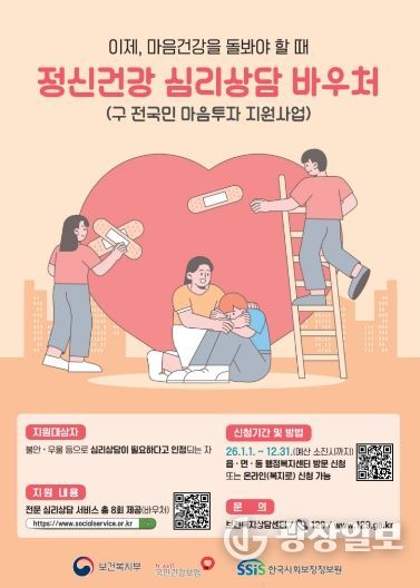광장일보 주재영 기자 | 영광군은 우울·불안 등 정서적 어려움을 겪는 군민의 마음건강 회복과 정신건강 증진을 위해 '정신건강 심리상담 바우처 사업'을 추진하고 있다.