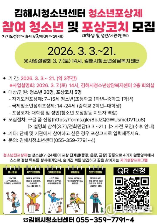 광장일보 주재영 기자 | 김해시청소년센터는 오는 3월 3일부터 21일까지 ‘2026년 청소년포상제’에 참여할 청소년과 이들의 활동을 지원할 포상코치를 공개 모집한다.