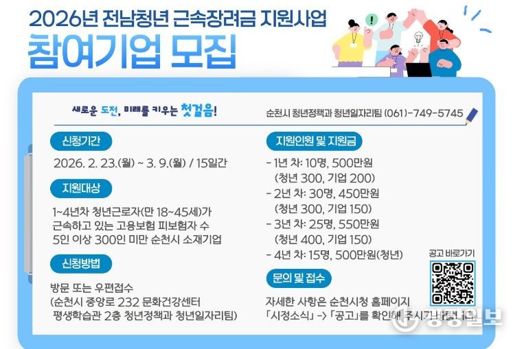 광장일보 주재영 기자 | 순천시는 지역 청년들의 정규직 취업 촉진 및 장기근속을 유도하기 위해 2026년 전남 청년 근속장려금 지원사업 참여 기업을 모집한다고 밝혔다.