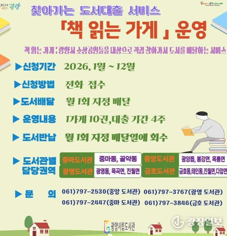 광장일보 주재영 기자 | 광양시립도서관은 지역사회 독서문화 확산을 위해 도서관 방문이 어려운 지역 내 소상공인을 대상으로 2026년 ‘책 읽는 가게’ 사업을 운영한다.
