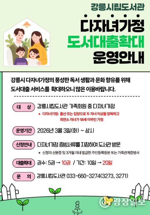 광장일보 이현나 기자 | 강릉시립도서관은 오는 3월 3일부터 도서관 가족회원 중 다자녀가정을 대상으로 도서 대출 서비스를 확대 운영한다.