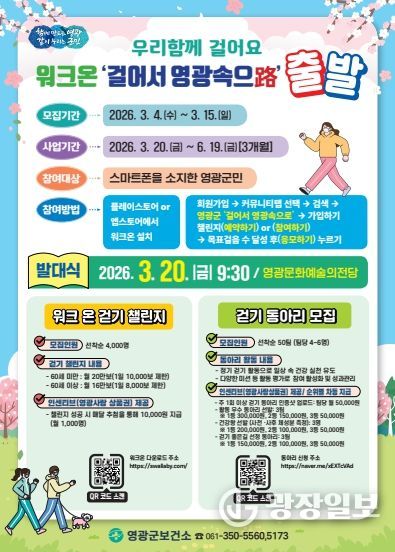 광장일보 주재영 기자 | 영광군은 군민들의 신체활동을 장려하고 비만 예방 및 만성질환을 관리하기 위해 모바일 걷기 앱 '워크온(Walk On)'의 모바일 커뮤니티 '걸어서 영광속으路’참여자 및 걷기 동아리를 3월 4일부터 3월 15일까지 모집한다고 밝혔다.