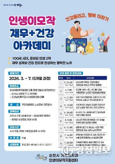 광장일보 주재영 기자 | 순천시는 중·장년층의 삶의 설계와 안정적인 노후 준비를 돕기 위해 ‘재무·건강 아카데미’ 수강생을 3월부터 7월까지 수시 모집한다고 밝혔다.