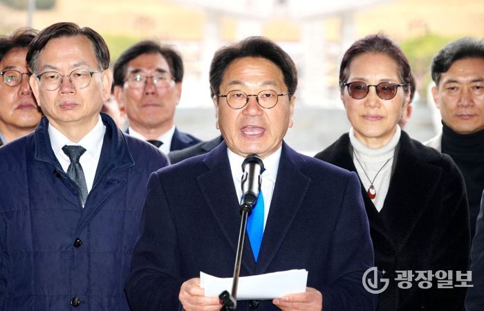강기정 시장 등 광주광역시 간부들과 공공기관장들은 2일 북구 국립5·18민주묘지를 참배한 뒤, 민주의문 앞에서 통합특별법 국회 통과 환영 입장문을 발표했다.