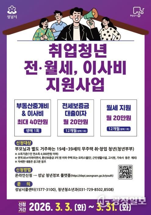 광장일보 주재영 기자 | 성남시는 사회초년생의 주거 안정을 돕기 위해 ‘취업 청년 전월세·이사비 지원사업’ 대상 인원을 기존 750명에서 1050명으로 늘렸다고 3일 밝혔다.