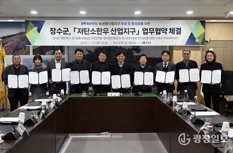 광장일보 주재영 기자 | 장수군은 27일 군청 2층 회의실에서 전북특별자치도 농생명산업지구로 지정된 ‘저탄소한우 산업지구’의 성공적인 조성과 활성화를 위해 관계기관‧단체와 업무협약(MOU)을 체결했다.