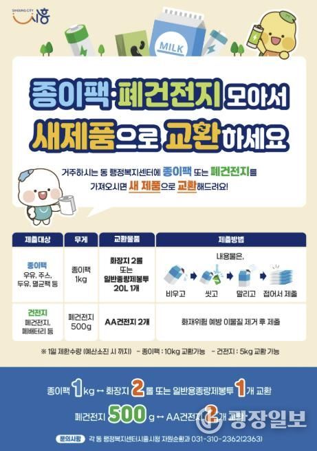 광장일보 주재영 기자 | 시흥시는 생활 속 자원순환 문화 확산을 위해 종이팩 교환 사업을 지속 추진하는 한편, 올해부터 폐건전지 교환 사업을 확대 시행한다.
