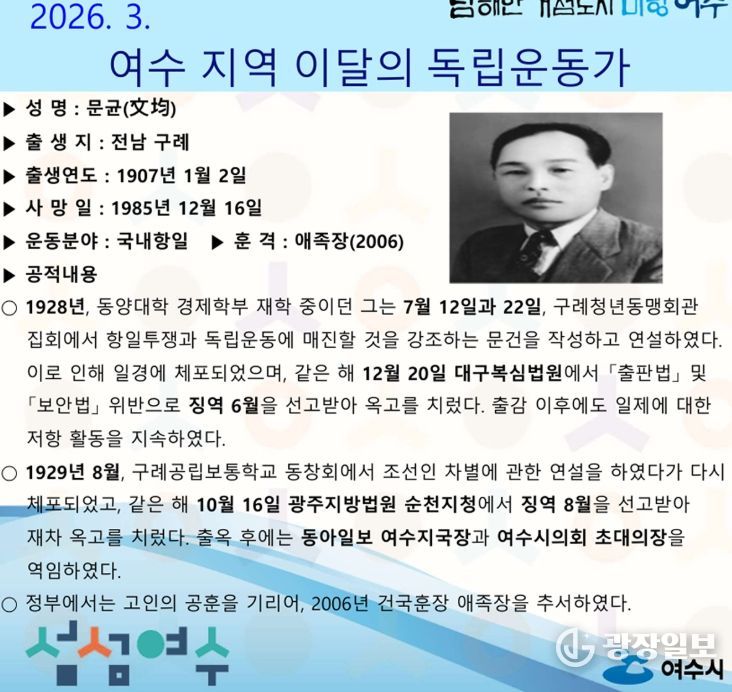 광장일보 주재영 기자 | 여수시는 2026년 3월의 독립운동가로 전남 구례 출신 ‘문균(文均)’ 선생을 선정했다.