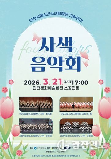 광장일보 주재영 기자 | 인천시립소년소녀합창단(예술감독 조현경)이 오는 3월 21일 인천문화예술회관 소공연장에서 4개 도시의 목소리가 한데 어우러지는 특별한 교류연주 '사색음악회'를 개최한다.