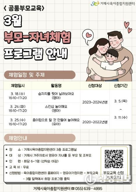 광장일보 주재영 기자 | 거제시육아종합지원센터는 영유아 가정을 대상으로 하는 공통부모교육 부모-자녀체험 활동 3월 참여자를 5일부터 11일까지 모집한다고 밝혔다.