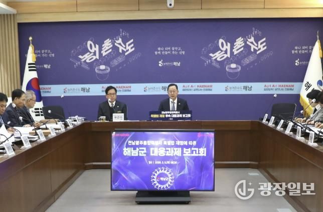 광장일보 주재영 기자 | 해남군은 5일 군청 상황실에서 전남광주통합특별시 설치 특례법 제정에 따른 대응과제 보고회를 개최하고, 통합특별시 출범에 대비한 지역 발전 전략을 종합 점검했다.