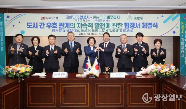 광장일보 주재영 기자 | 안성시는 2026년 3월 4일 오전 11시 안성시청 본관 2층 상황실에서 일본 가나가와현 가마쿠라시(시장 마쓰오 다카시)와 '도시 간 우호 관계의 지속적 발전에 대한 협정'을 체결하고 양 도시 간 문화·예술 및 청소년 분야 교류를 본격 추진하기로 했다.