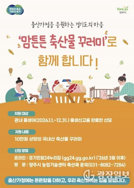 광장일보 주재영 기자 | 양주시는 출산 가정의 건강 증진과 지역 축산물 소비 촉진을 위해 ‘2026년 맘튼튼 축산물 꾸러미 지원사업'을 추진한다.