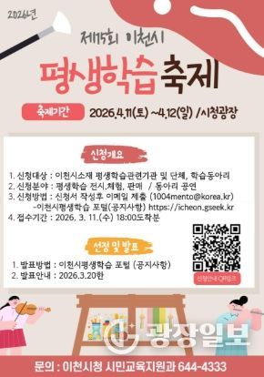 부스 및 공연 참가 신청은 3월 11일까지 접수하며, 신청서 양식은 이천시 평생학습 포털 내 소식정보(공지사항)에서 내려받을 수 있다. 심사 결과는 평생학습실무추진위원회 심사를 거쳐 3월 중 발표될 예정이다.