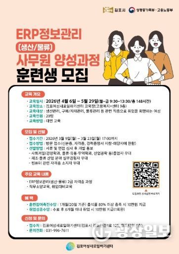 광장일보 주재영 기자 | 김포여성새로일하기센터는 지역 산업 수요에 부합하는 전문 인력 양성과 경력보유 여성의 안정적인 취업 지원을 위해 '전사적 자원관리(ERP) 생산·물류 사무원 양성 과정' 훈련생을 모집한다.