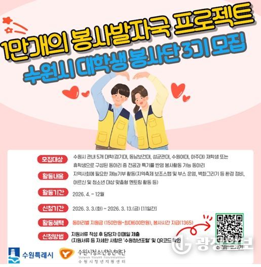 광장일보 박균현 기자 | 수원시청소년청년재단 수원시청년지원센터는 3월 3일부터 3월 13일까지 지역사회 봉사 문화를 확산하고 대학생들의 사회공헌 활동을 지원하기 위한 '1만 개의 봉사발자국' 참여 동아리를 모집한다.
