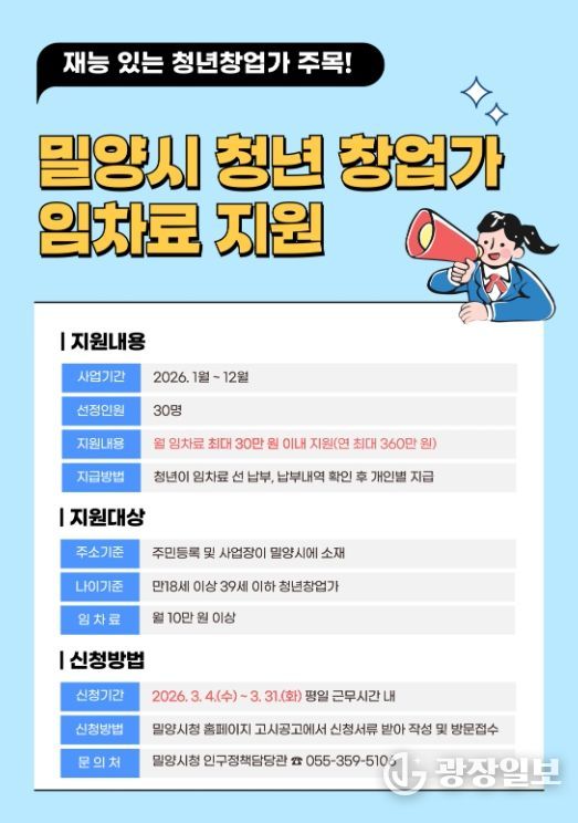 광장일보 주재영 기자 | 경남 밀양시는 고물가와 경기 침체로 어려움을 겪는 청년 창업가들의 초기 경영 부담을 덜어주고 지역 내 안정적인 정착을 돕기 위해 ‘2026년 청년창업가 임차료 지원사업’ 대상자를 모집한다.