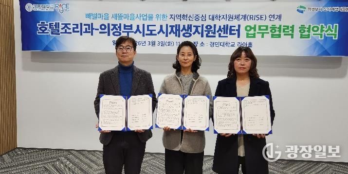 광장일보 주재영 기자 | 의정부시도시재생지원센터는 3월 3일 경민대학교 호텔조리과와 성공적인 빼벌새뜰마을사업을 위해 업무협약을 체결했다.