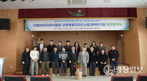 광장일보 이현나 기자 | 강원특별자치도 산림과학연구원(원장 채병문)은 3월 6일 국립DMZ자생식물원 국제회의실에서 DMZ 및 접경지역 자생식물의 현지 외 보전과 육성을 위한 협력 강화를 위해 국립DMZ자생식물원(원장 이봉우)과 업무협약을 체결했다.
