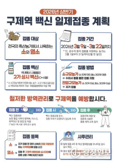광장일보 이현나 기자 | 홍천군은 구제역 유입 방지와 완전 차단을 위해 상반기 구제역 일제 백신접종을 실시한다. 대상은 1,001 농가 36,830두(소 928 농가 33,566두, 염소 73 농가 3,264두) 사육 농가이다.