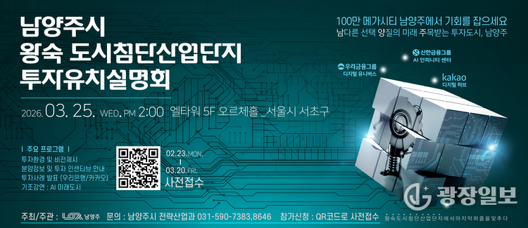 남양주시= 주재영 기자 | 남양주시는 오는 25일 서울 서초구 엘타워에서 ‘왕숙 도시첨단산업단지 투자유치설명회’를 열고 기업을 대상으로 시의 투자환경을 소개한다고 밝혔다.