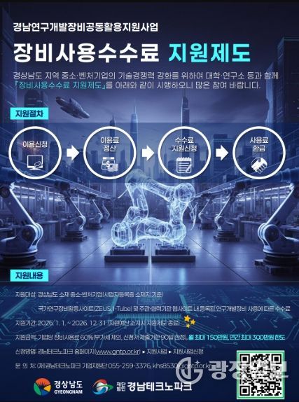 광장일보 주재영 기자 | 경상남도는 연구개발장비의 공동활용을 활성화하고 도내 기업의 기술경쟁력 강화를 위해 ‘2026년 연구개발장비 공동활용지원사업’을 시행한다고 밝혔다.