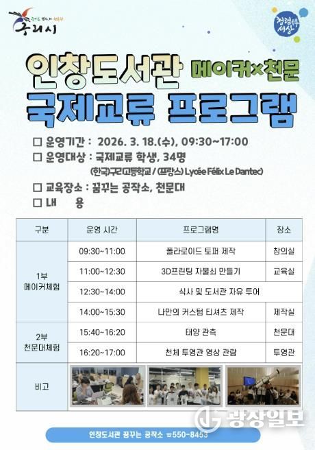 광장일보 주재영 기자 | 구리시 인창도서관 꿈꾸는 공작소는 오는 3월 18일, 관내 학교의 국제교류 학사 일정과 연계해 외국인 학생들에게 한국 도서관의 특화된 메이커 문화와 천문 관측 활동을 소개하는 ‘메이커×천문 국제교류 프로그램’을 운영한다.