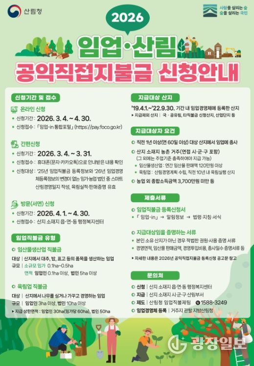 광장일보 주재영 기자 | 고흥군은 임업·산림의 공익기능을 증진하고 임업인의 소득 안정을 지원하기 위해 ‘2026년도 임업·산림 공익직접지불금(임업직불금)’ 등록 신청을 4월 30일까지 접수한다고 밝혔다.