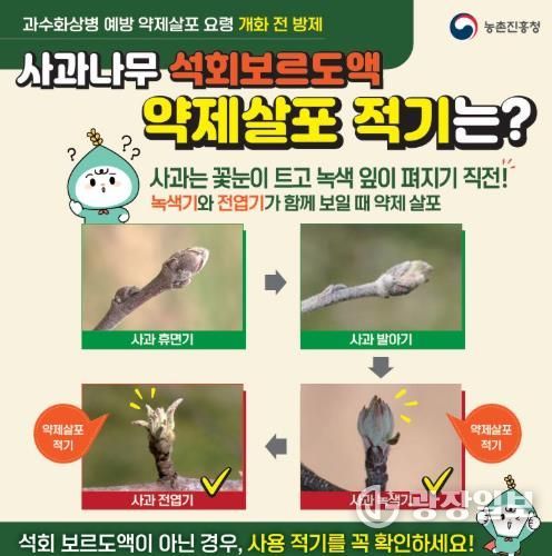 또한 과수의 생육 단계를 확인한 뒤 적기에 1차 약제를 살포해야 하며, 석회유황합제와 함께 살포할 경우 약해가 발생할 수 있어 석회유황합제 살포 후 최소 7일 이상의 간격을 두어야 한다.