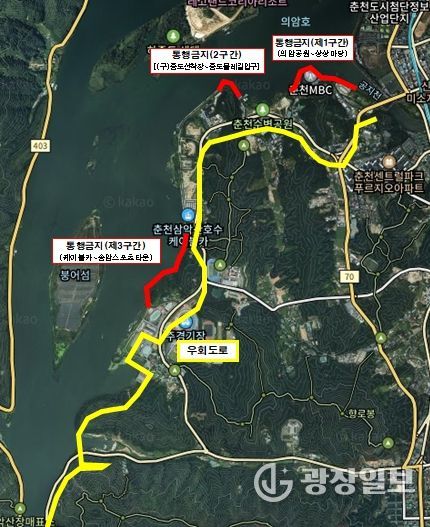 통행 제한 구간은 △의암공원~KT&G 상상마당(0.45㎞) △삼천동 구 중도선착장~중도물레길 입구(0.37㎞) △삼악산호수케이블카~송암스포츠타운(0.8㎞) 등 3곳이다. 통행 제한 기간은 구간별로 다르다. 의암공원~KT&G 상상마당 구간은 11일부터 20일까지, 삼천동 구 중도선착장~중도물레길 입구 구간은 13일부터 20일까지, 삼악산호수케이블카~송암스포츠타운 구간은 11일부터 31일까지 통행이 제한된다. 공사 여건에 따라 통행 제한 기간은 일부 조정될 수 있다.