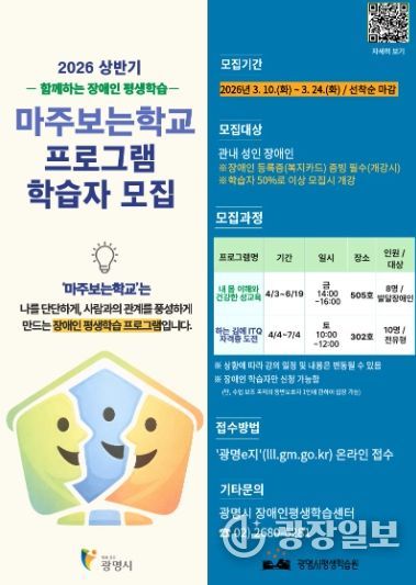 광장일보 주재영 기자 | 광명시 평생학습원은 장애인 학습자의 자기 이해와 사회 참여 역량 강화를 위한 평생학습 프로그램 ‘마주보는학교’의 상반기 수강생을 오는 24일까지 모집한다.