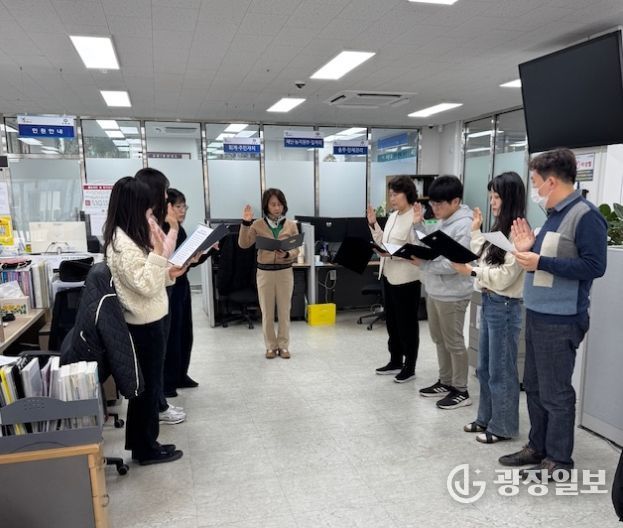 광장일보 주재영 기자 | 구리시 교문1동 행정복지센터는 지난 9일 민원인에게 더 친절하고 책임감 있는 행정서비스를 제공하기 위해‘민원 친절 다짐 선언’을 실시했다.