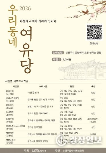 시 관계자는 “우리동네 여유당은 시민의 생활권 가까이에서 정약용의 사상과 인문학을 접하도록 기획한 사업”이라며 “앞으로도 지역 문화공간과 협력해 시민 누구나 쉽게 참여할 수 있는 정약용 콘텐츠를 확대해 나가겠다”고 말했다.