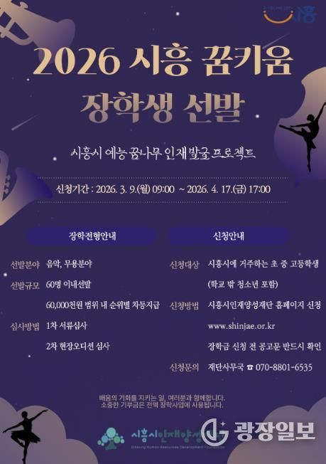 광장일보 주재영 기자 | 시흥시인재양성재단은 지역 내 예능 분야 인재를 발굴ㆍ육성하기 위해 ‘2026년 시흥 꿈키움 장학생’을 60명 이내로 선발한다.