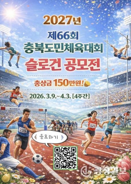 광장일보 이현나 기자 | 충북 보은군이 2027년 보은에서 개최되는 '제66회 충북도민체육대회'의 성공적인 개최와 참여 분위기 조성을 위해 대회 슬로건 공모전을 진행한다고 11일 밝혔다.