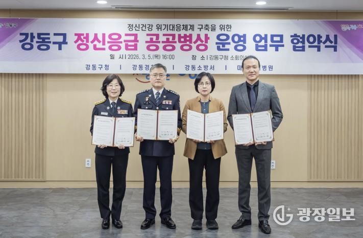 광장일보 주재영 기자 | 서울 강동구는 지난 5일 구청에서 강동경찰서, 강동소방서, 마인드웰병원과 24시간 정신응급 공공병상 운영을 위한 업무협약을 체결하고 오는 15일부터 본격 운영한다고 밝혔다.
