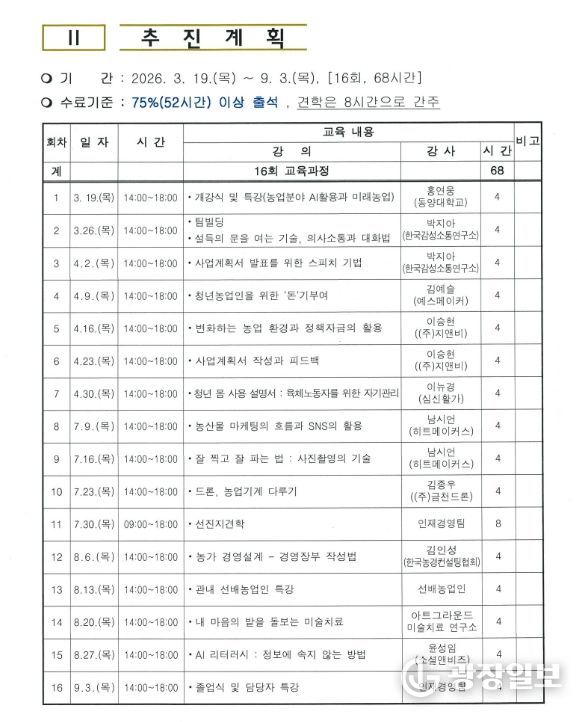이번 청년농업인과정은 3월 19일 개강식을 시작으로 9월 3일까지 총 16회에 걸쳐 운영될예정이며 특히 변화하는 농업 환경에 발맞추어 청년농업인들이 현장에서 필요로 하는실질적인 지식과 기술을 전달하고 농촌의 안정적인 정착을 도모할 수 있는 다양한프로그램이 마련되어 기대를 모으고 있다.