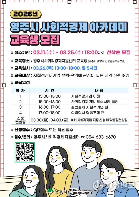 광장일보 주재영 기자 | 영주시와 영주시사회적경제지원센터는 신규 사회적경제기업 발굴 및 육성을 위해 '2026 영주시 사회적경제 아카데미' 교육생을 3월 11일부터 25일까지 모집한다.