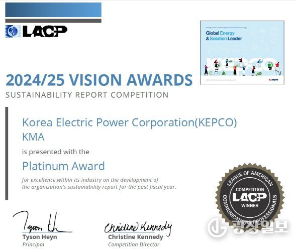 광장일보 주재영 기자 | 한국전력의 지속가능경영보고서가 미국 커뮤니케이션 연맹 LACP(League of American Communications Professionals)가 주최하는 '2024/25 비전어워드(Vision Awards)'유틸리티 분야에서 2016년 이후 10년 만에 최고 등급인'대상(Platinum)'을 수상했다.