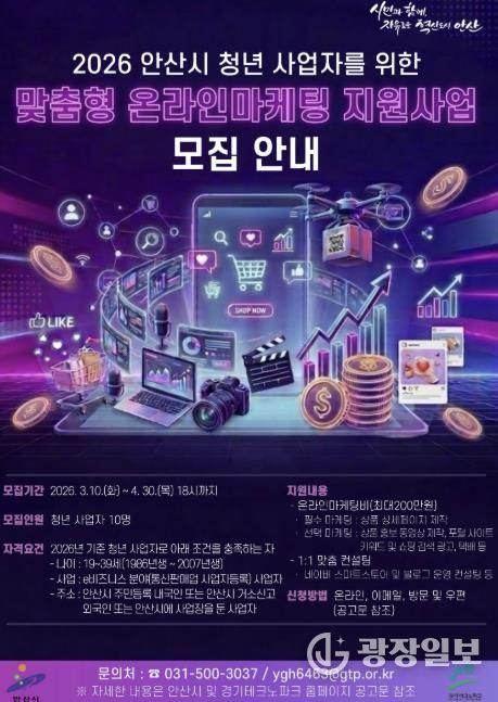 광장일보 주재영 기자 | 안산시는 온라인 시장에서 상품 홍보와 매출 확대를 희망하는 청년 사업자를 대상으로 ‘맞춤형 온라인마케팅 지원사업’ 참여자를 모집한다고 11일 밝혔다.