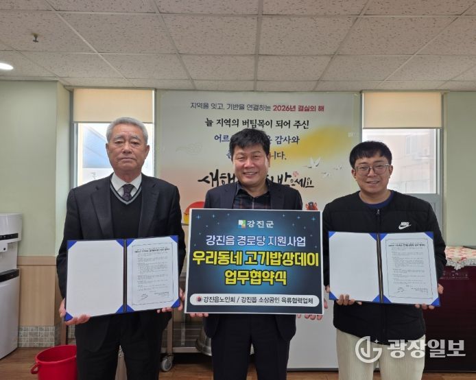 광장일보 주재영 기자 | 강진읍 노인회가 지난 4일, 2026년 ‘우리동네 고기밥상데이’ 사업의 원활한 추진을 위해 강진읍 소상공인 육류협력업체와 업무협약을 체결했다.