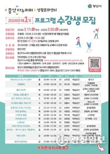광장일보 주재영 기자 | 양산시는 오는 3월 11일부터 20일까지 10일간 ‘2026년 제1기 증산다누리터 생활문화센터’시민 문화강좌 수강생을 모집한다.