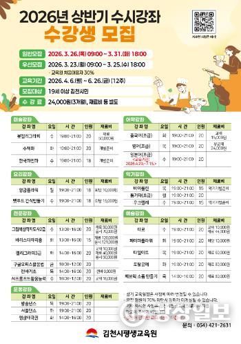 광장일보 주재영 기자 | 김천시평생교육원은 2026년 야간강좌 집중 편성과 수요자 맞춤형 교육 강화를 위해 수시강좌를 대폭 확대하여 오는 3월 23일부터 31일까지 수강생을 모집한다.