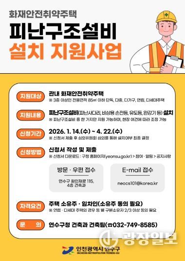 이에 연수구는 2023년부터 3층 이상이면서 전용면적 85㎡ 미만인 소규모 주택에 피난사다리, 유도등, 휴대용 비상조명, 완강기 등 피난구조설비 설치를 지원하는 사업을 시행하고 있다.