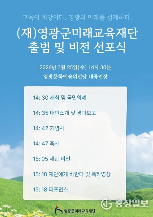광장일보 주재영 기자 | 영광군미래교육재단은 오는 3월 25일 오후 2시 30분, 영광문화예술의전당 대공연장에서 '영광군미래교육재단 출범 및 비전선포식'을 개최한다.