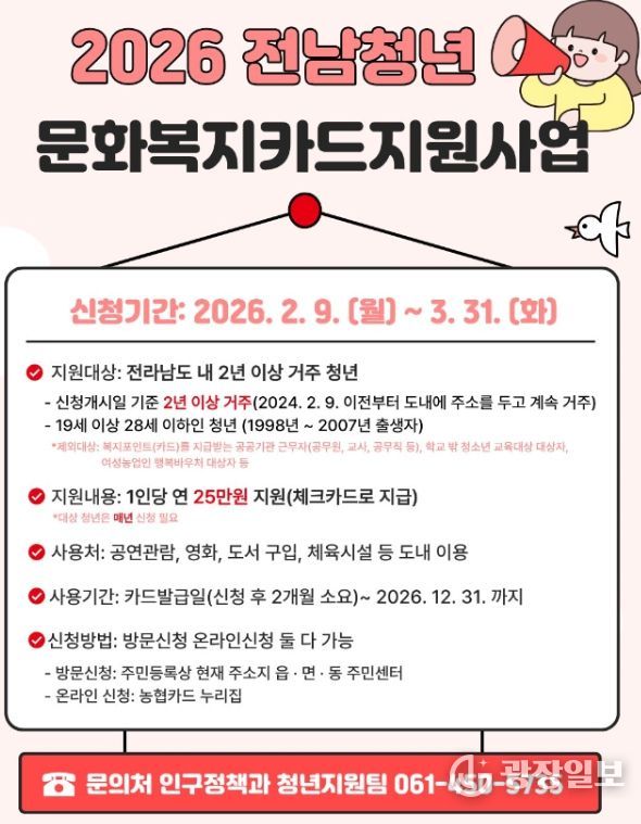 광장일보 주재영 기자 | 무안군은 청년의 문화생활과 자기계발을 지원하기 위해 ‘2026년 전남 청년 문화복지카드 지원사업’ 대상자를 모집하고 있다고 밝혔다.