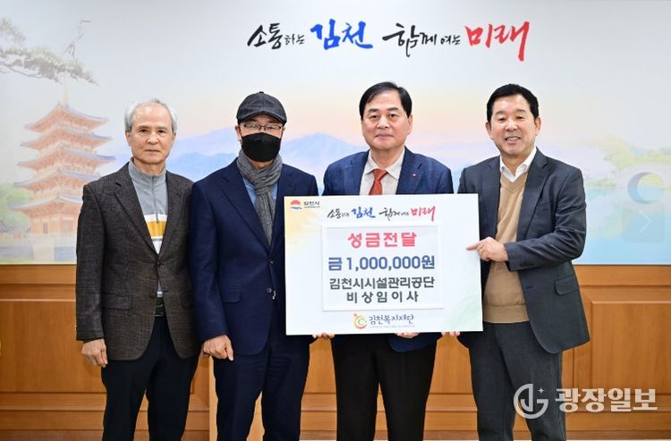 광장일보 주재영 기자 | 김천시는 지난 11일, 김천시시설관리공단(이사장 김재광)의 강국원·김영조·변성철 비상임이사 3인으로부터 성금 100만 원을 전달받았다고 밝혔다.